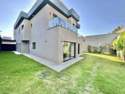- 4 suítes, sendo (1 reversível no térreo e 3 suítes no piso superior) com persianas elétricas, preparadas para ar condicionado, varandas com guarda corpo de vidro e metal. A suíte master com saleta, toda planejada com painel TV, closet sr e sra, gavetas com amortecedores, penteadeira com espelho e iluminação.